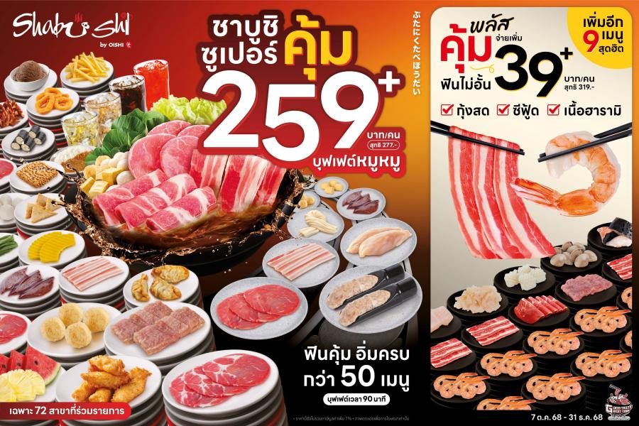 พร้อมให้บริการแล้วกว่า 72 สาขาทั่วประเทศ ที่ ชาบูชิ สาขาในไฮเปอร์มาร์เก็ต ครอบคลุมทำเลหลัก เช่น บิ๊กซี โลตัส และคอมมูนิตี้มอลล์ต่าง ๆ (ดูสาขาที่ร่วมรายการ คลิก https://oishifood.com/page/shabushi-buffet259) ตั้งแต่ 7 ตุลาคม 2568 – 31 ธันวาคม 2568 เพื่อกระตุ้นกำลังซื้อและสร้างความคึกคักให้ตลาดร้านอาหารช่วงปลายปี