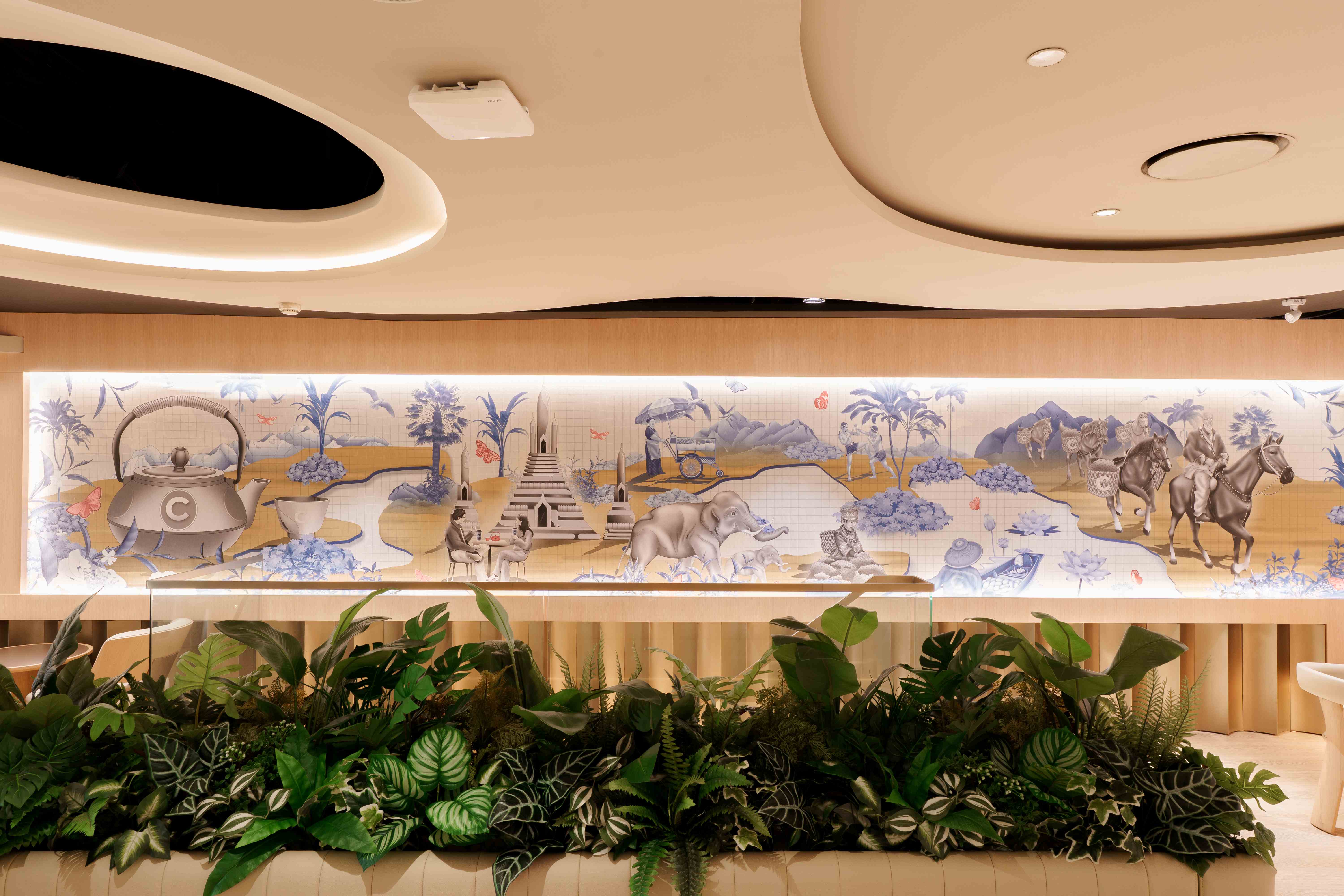 ไฮไลต์สำคัญด้านการสื่อสารแบรนด์คือการทำ Localization Strategy ผ่านผลงานภาพวาดระดับมาสเตอร์พีซบนผนังของร้านที่สร้างสรรค์ขึ้นร่วมกับศิลปินไทยอย่าง Pomme Chan (ปอม ชาน) ที่คร่ำหวอดอยู่ในวงการศิลปะโดยเฉพาะการสร้างสรรค์งานภาพประกอบมามากกว่า 20 ปี มาร่วมถ่ายทอดเรื่องราวการเดินทางของวัฒนธรรมชาผ่านลวดลายไทยร่วมสมัย เพื่อสร้างความเชื่อมโยงระหว่างแบรนด์ระดับโลกและอัตลักษณ์ท้องถิ่นได้อย่างลงตัว