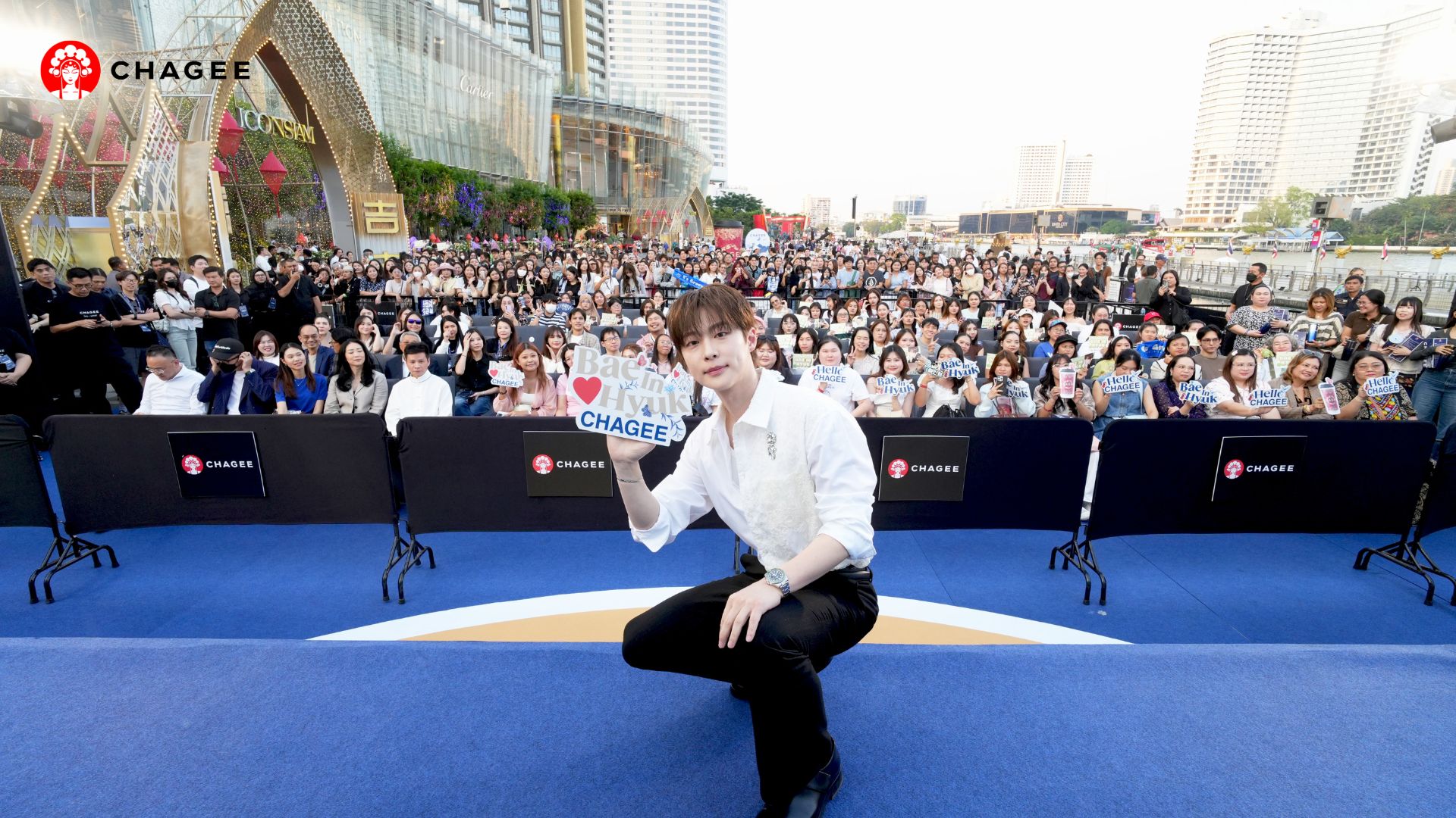 ในงานเปิดตัวครั้งนี้ CHAGEE ใช้กลยุทธ์ Fandom Marketing ด้วยการดึงพระเอกหนุ่มฮอต “Bae In Hyuk” (แบอินฮยอก) มาร่วมสร้าง Brand Experience สุดเอ็กซ์คลูซีฟริมแม่น้ำเจ้าพระยา ซึ่งเจ้าตัวได้ร่วมการันตีความอร่อยและพรีเมียมของชาผ่านการลิ้มลองเมนูซิกเนเจอร์ยอดนิยมอย่าง BO•YA Jasmine Green Milk Tea (ชาเขียวมะลินม) และเมนูเอ็กซ์คลูซีฟเฉพาะสาขานี้เท่านั้นอย่าง Ceylon Black Milk Tea (ชานมซีลอน) พร้อมยกระดับความใกล้ชิดด้วยกิจกรรม Tea Barista : Tea Makingโชว์สกิลชงชานมแบบสด ๆ และเสิร์ฟให้กับ Lucky Fans บนเวที