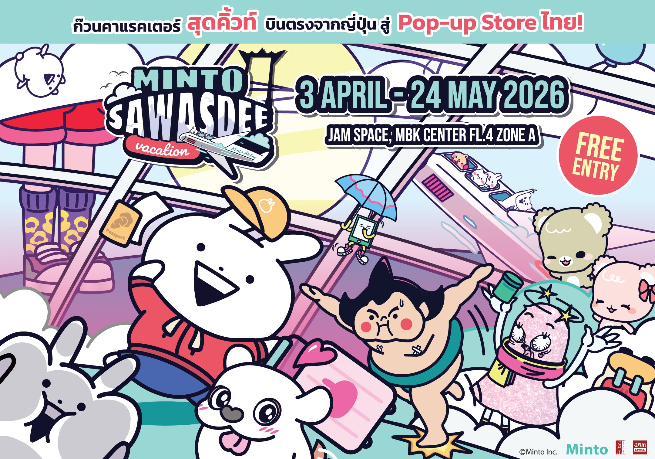 ยกก๊วนคาแรคเตอร์สุดคิ้วท์บินตรงจากญี่ปุ่นถึงไทยแล้ว!! ศูนย์การค้าเอ็ม บี เค เซ็นเตอร์ ชวนเปิดประสบการณ์ความน่ารักระดับโลกกับ “Minto Sawasdee Vacation” ป๊อปอัพสโตร์แนวใหม่ที่ผสานเสน่ห์ความเป็นไทยเข้ากับสไตล์คาวาอี้อย่างลงตัว โดย Japan Anime Movie Thailand (JAM) เนรมิตพื้นที่จัดแสดงนิทรรศการอนิเมะ JAM SPACE ชั้น 4 โซน A ให้กลายเป็นแลนด์มาร์คท่องเที่ยวไทยในมุมมองสุดสร้างสรรค์ ต้อนรับนักช้อปและสายถ่ายรูปให้มาสัมผัสความฟินได้ตั้งแต่วันนี้ – วันอาทิตย์ที่ 24 พฤษภาคม 2569